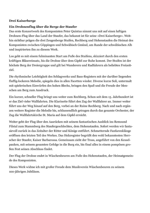 Peter Quintus nimmt uns mit seinem ersten Konzertwerk 'Drei Kaiserberge' auf einen luftigen Drohnen-Flug über das Land der Staufer. Weithin sichtbar prägen die drei Zeugenberge Stuifen, Rechberg und Hohenstaufen die Heimat des Komponisten, die zwischen Göppingen und Schwäbisch Gmünd, am Rande der schwäbischen Alb liegt.