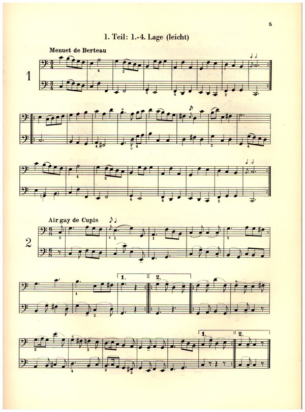 Stähelin, Dieter, ed Eine Auswahl von Duetten aus der Sammlung 'Recueil d'airs choisis des meilleurs auteurs ajustés pour le violoncelle par Mr. Cupis le Jeune', die um 1770 in Paris erschien. Die Ausgabe orientiert sich weitestgehend am Notentext der Vorlage und ist vorsichtig um (kenntlich gemachte) Bögen und Fingersätze ergänzt. Die Auswahl der Duette erfolgte im Hinblick auf die Verwendbarkeit im Unterricht.