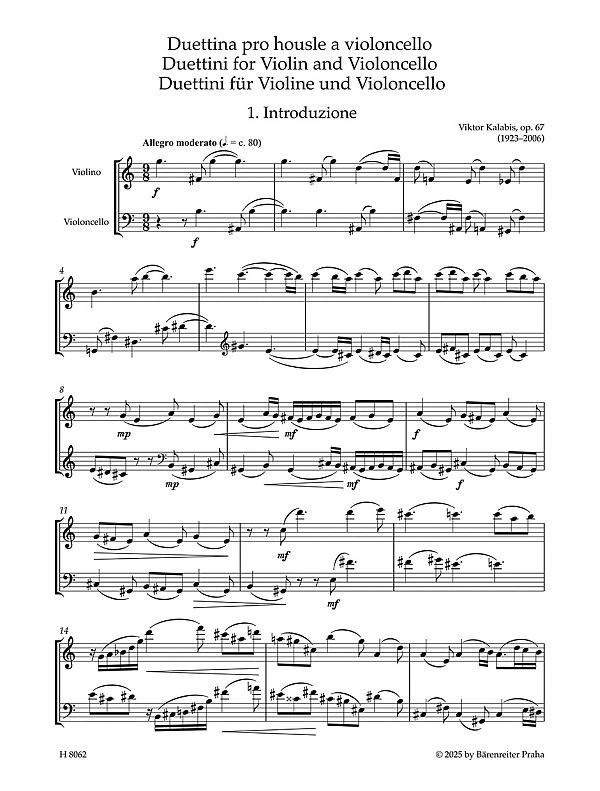 Innerhalb des umfangreichen Werks von Viktor Kalabis (1923-2006), einem der bedeutendsten tschechischen Komponisten des 20. Jahrhunderts, nimmt die Kammermusik einen wichtigen Platz ein. Dazu gehören auch die "Duettini für Violine und Violoncello" op.67 aus dem Jahr 1987. Kalabis schrieb sie für die Geigerin Jana Vlachová und den Cellisten Mikael Ericsson, die sie im Jahr 1991 in Domalice uraufführten. Die "Duettini" bestehen aus vier ausdrucksstark kontrastierenden Sätzen und blieben bisher unveröffentlicht, die Erstausgabe basiert auf dem Autograph, das im Stiftungsfonds von Viktor Kalabis und Zuzana Ruicková aufbewahrt wird.