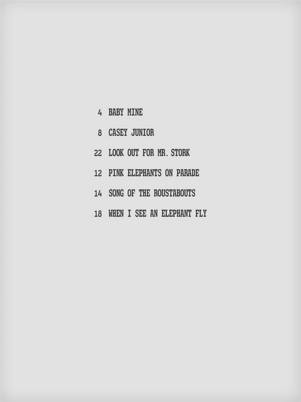 Wallace, Oliver, co-author Walt Disney 6 Selections from the original 1941 full Length Feature Production in Technicolor Baby mine Casey junior Look out for Mr. Stork Pink Elephants on Parade Song on the Roustabouts When I see an Elephant fly