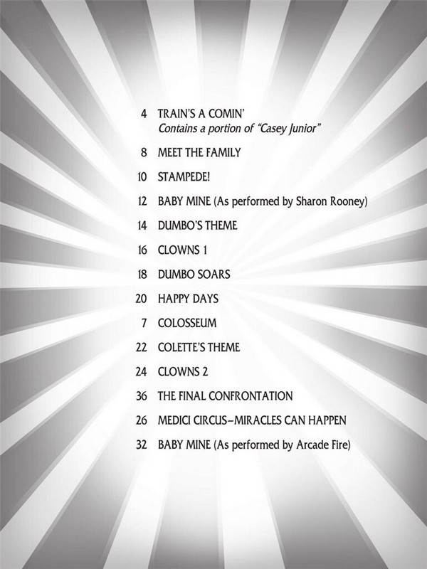 Music from the original Motion Picture Soundtrack Train's a comin' Met the Family Stampede Baby mine Dumbo's Theme Clowns 1 Dumbo soars Happy Days Colosseum Colette's Theme Clowns 2 The final Confrontation Medici Circus - Miracles can happen Baby mine