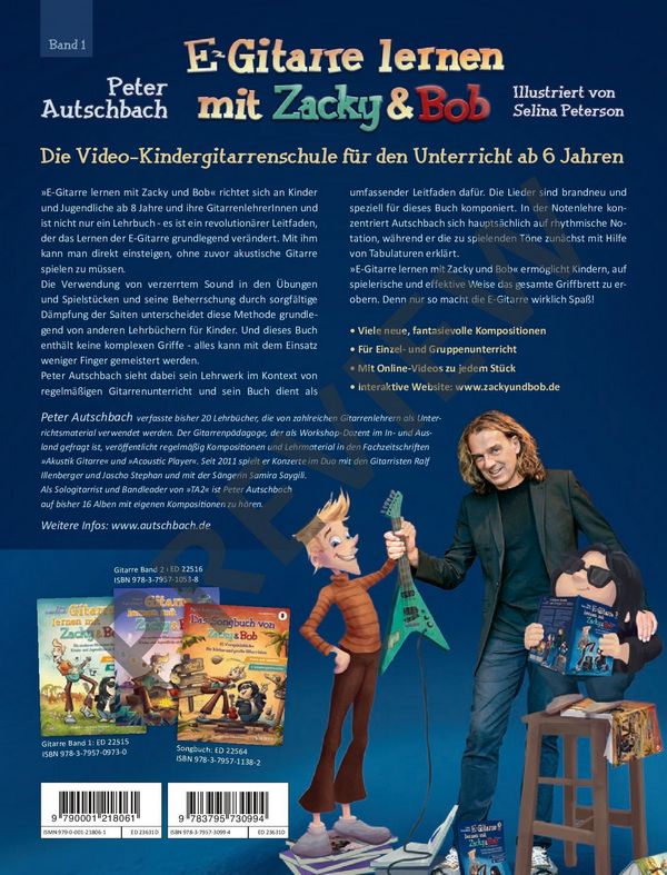 Die Video-Kindergitarrenschule für den Unterricht ab 6 Jahren 'E-Gitarre lernen mit Zacky & Bob' ermöglicht Kindern und Jugendlichen ab 6 Jahren im Einzel- und Gruppenunterricht einen modernen Zugang zur E-Gitarre. Jede Menge Übungen und Spielstücke wurden eigens für Band 1 komponiert und dabei die vielfältigen Möglichkeiten der elektrischen Gitarre berücksichtigt. Die bewährte Kombination von Noten und Tabulatur ermöglicht ein Erleben des gesamten Griffbretts und frühes Spiel von Licks und Powerchords. Zusätzliche Lehrvideos werden auf www.zackyundbob.de angeboten und erklären anschaulich, wie das Spiel mit dem verzerrten Sound der E-Gitarre genau funktioniert.