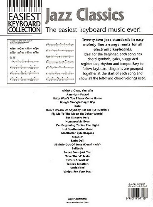 Alright okay you win American Patrol Baby won't you please come home Boogie Woogie Bugle Boy Cute Don't dream of anybody but me (Li'l Darlin') Fly me to the Moon (In other Words) For Dancers only Honeysuckle Rose I'm beginning to see the Light In a sentimental Mood Meditation (Meditacao) Moanin' Satin Doll Slihtly out of Tune (Desafinado) Solitude Sweet Sue just you Take the A Train Time's A-wastin' Tuxedo Junction Undecided Violets for your Furs Jazz classics Easiest Keyboard Collection