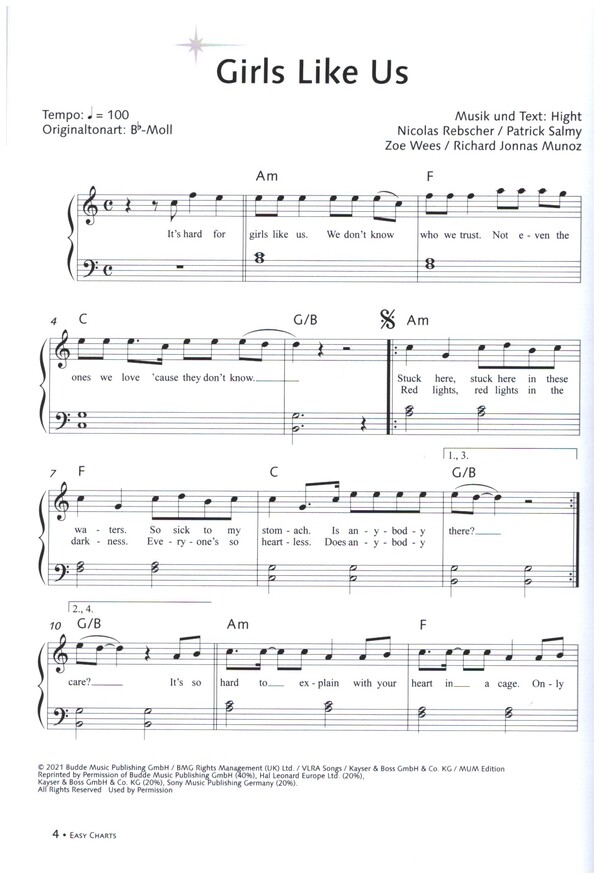 Music Factory Bye, Uwe, arr. Mit Easy Charts 12 erscheint eine Sammlung aktueller Hits, die Anfänger am Klavier schon nach dem ersten Unterrichtsjahr spielen können. Dabei dürfen die großen Hits angesagter Popstars natürlich nicht fehlen: Airplay-Dauerbrenner von Dua Lipa (Levitating), P!nk (Cover Me In Sunshine) und der ESC-Sieger Måneskin (Beggin') und viele mehr warten nur darauf, gekonnt in Szene gesetzt zu werden. So machen das Üben und Spielen zuhause und vor Publikum gleich noch mehr Spaß. Girls Like Us (Zoe Wees) Wer wenn nicht wir (Wincent Weiss) Levitating (Dua Lipa) Wellerman (Nathan Evans / Traditional) Afterglow (Ed Sheeran) Hypnotized (Purple Disco Machine) We Are The People (Martin Garrix feat. Bono & The Edge) Beggin (Måneskin) Without You (The Kid LAROI) Save Your Tears (The Weeknd) Drivers License (Olivia Rodrigo) Cover Me In Sunshine (Pink & Willow Sage Hart)