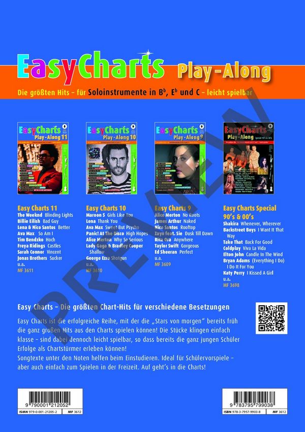 Music Factory Bye, Uwe, arr. Easy Charts Play-Along 12 ist die neueste Ausgabe der erfolgreichen Reihe, mit der Nachwuchsmusiker aktuelle Chart-Hits nachspielen können. Dazu gehören u.a. Afterglow von Ed Sheeran, Girls Like Us der TikTok-Trendsetterin Zoe Wees oder Without You von The Kid LAROI. Alle Bearbeitungen liegen als C-, B- und Es-Stimmen vor und können somit von verschiedenen Instrumenten gespielt werden, wie Flöte, Klarinette, Saxophon oder Trompete. Girls Like Us (Zoe Wees) Wer wenn nicht wir (Wincent Weiss) Levitating (Dua Lipa) Wellerman (Nathan Evans / Traditional) Afterglow (Ed Sheeran) Hypnotized (Purple Disco Machine) We Are The People (Martin Garrix feat. Bono & The Edge) Beggin (Måneskin) Without You (The Kid LAROI) Save Your Tears (The Weeknd) Drivers License (Olivia Rodrigo) Cover Me In Sunshine (Pink & Willow Sage Hart)