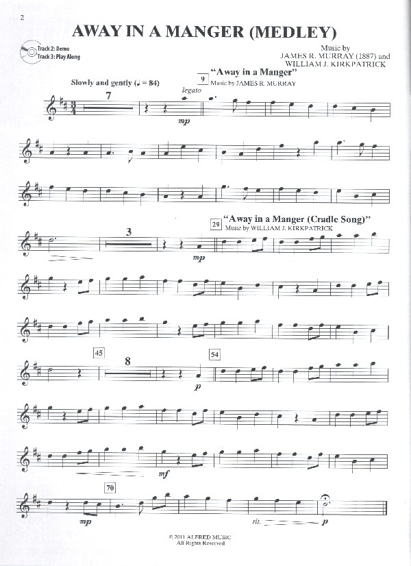 Easy instrumental play-along Level 1 Angels We Have Heard on High Away in a Manger (Medley) Come, Thou Long-Expected Jesus Go, Tell It on the Mountain We Three Kings Hark! The Herald Angels Sing It Came Upon a Midnight Clear Joy to the World O Come All Ye Faithful O Come, O Come, Emmanuel O Little Town of Bethlehem Silent Night The First Noel What Child Is This