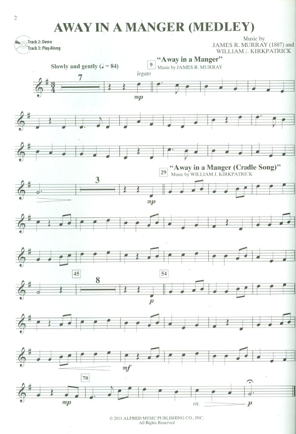 Easy instrumental play-along Level 1 Angels We Have Heard on High Away in a Manger (Medley) Come, Thou Long-Expected Jesus Go, Tell It on the Mountain We Three Kings Hark! The Herald Angels Sing It Came Upon a Midnight Clear Joy to the World O Come All Ye Faithful O Come, O Come, Emmanuel O Little Town of Bethlehem Silent Night The First Noel What Child Is This