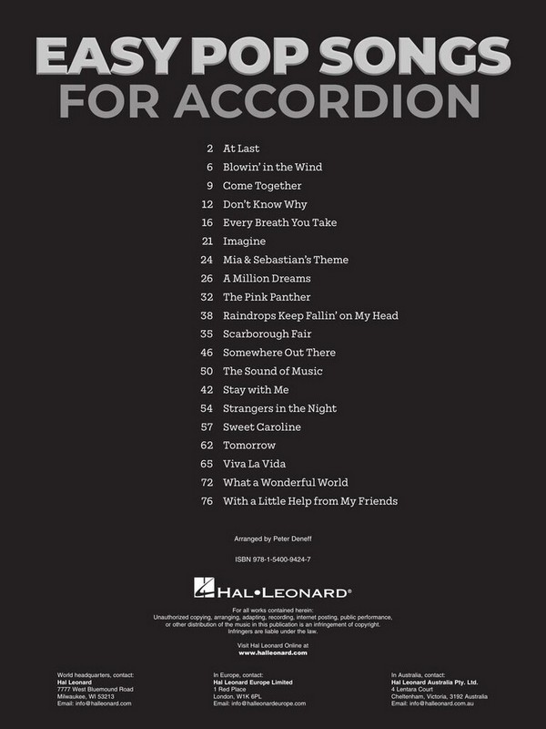 This songbook features 20 well-known hits arranged for accordion, complete with lyrics! Songs include: At Last Blowin' In The Wind Come Together Don't Know Why Every Breath You Take Imagine Mia & Sebastian's Theme A Million Dreams The Pink Panther Raindrops Keep Fallin' On My Head River Flows In You Scarborough Fair Somewhere Out There The Sound Of Music Strangers In The Night Sweet Caroline Tomorrow Viva La Vida What A Wonderful World With A Little Help From My Friends