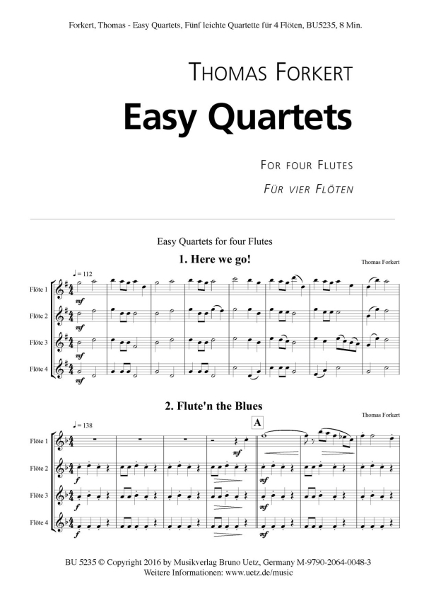 5 leichte Quartette Here we go Scarborough Fair Hello Mr. D. Flute'n the Blues Festivo