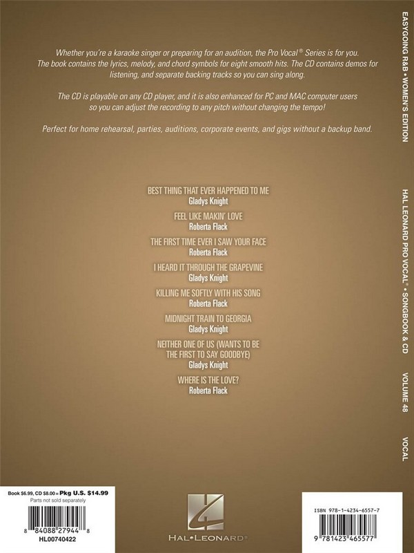 Better than Karaoke CD with unique Pitch-Changer Rhythm and Blues Best Thing that ever happened to me Feel like Makin' Love I heard it through the Grapevine Killing me softly with his Song Midnight Train to Georgia Neither One of Us The first Time ever I saw your Face Where is the Love