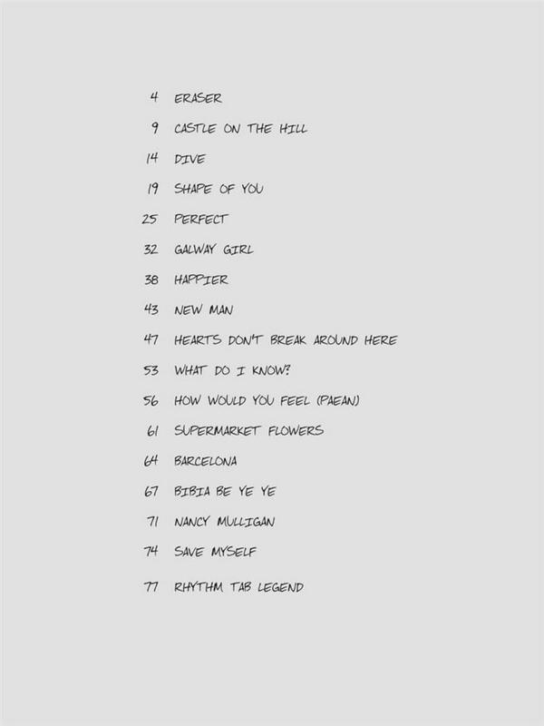 : (Divide) Barcelona Bibia Be Ye Ye Castle On The Hill Dive Eraser Galway Girl Happier Hearts Don't Break Around Here How Would You Feel (Paean) Nancy Mulligan New Man Perfect Save Myself Shape Of You Supermarket Flowers What Do I Know?