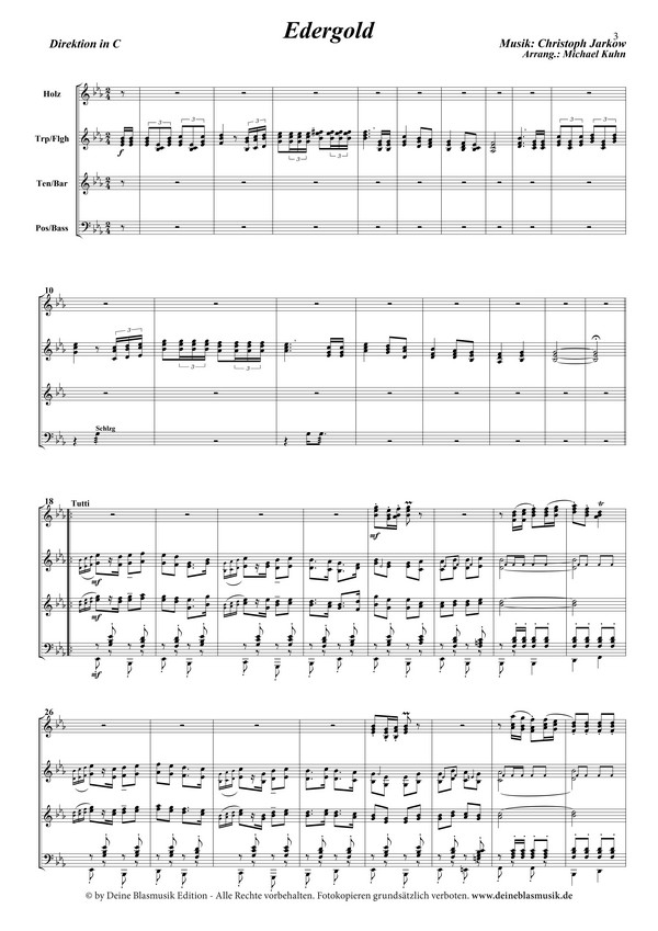 'Edergold' ist eine faszinierende Komposition von Christoph Jarkow, welche er der namensgebenden Blasmusikformation 'Edergold' aus Nordhessen gewidmet hat. Diese ausdrucksstarke Komposition nimmt den Zuhörer mit auf eine klangliche Reise entlang des Flusses Eder, dessen sanfte Strömung und majestätische Pracht in den musikalischen Motiven widergespiegelt werden.
