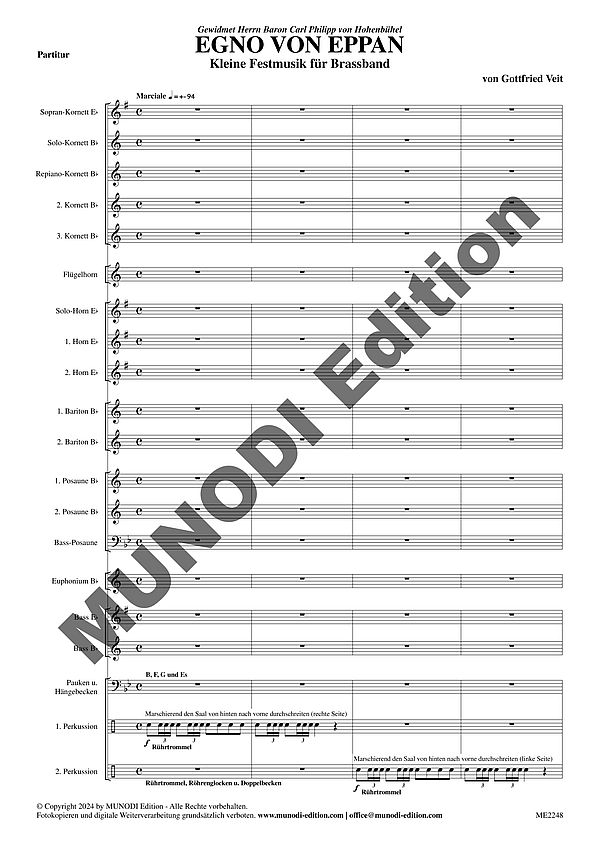 Am 1. Juni 2023 jährte sich zum 750sten Mal der Todestag des Egno von Eppan. Bischof Egno war der letzte legitime Spross seiner Adelsfamilie. Mit ihm starben die Grafen von Eppan 1273 aus. Die kleine Festmusik für Brassband mit dem Titel EGNO VON EPPAN aus der Feder von Gottfried Veit möchte vor allem mit zwei Elementen in die Zeit des Mittelalters eintauchen. Zum einen hat der Beginn des Hauptthemas der hohen Blechbläser ohne Zweifel 'Renaissancecharakter' und zum anderen wird die Komposition von zwei Rührtrommeln (Landknechtstrommeln), also historischen Schlaginstrumenten, eingeleitet. Die beiden Spieler dieser Membranophone eröffnen das Werk, indem sie im Wechselspiel durch den Saal schreiten. Gemeinsam trommeln sie erst ab jenen Moment, wo das 'Tutti' der Brassband einsetzt. Der Hauptteil des Werkes ist dann geprägt von Fanfarenstößen der hohen Blechblasinstrumente. Nachher folgt ein ruhiger Mittelteil im 'Moderato religioso', der in den ersten zwölf Takten von einem Solo des Flügelhorns intoniert wird, welches im Anschluss daran das Ensemble im Halbplenum aufgreift. Röhrenglocken unterstreichen hier den religiösen Hintergrund dieses Abschnittes. Durch die Wiederkehr des Hauptteiles im 'Tempo primo' entsteht eine allseits bewährte dreiteilige Liedform. Diese wird schließlich durch einige Schlussbestätigungen im 'Grandioso' ergänzt, welche sämtliche Klangmittel einer Brassband aufbieten.