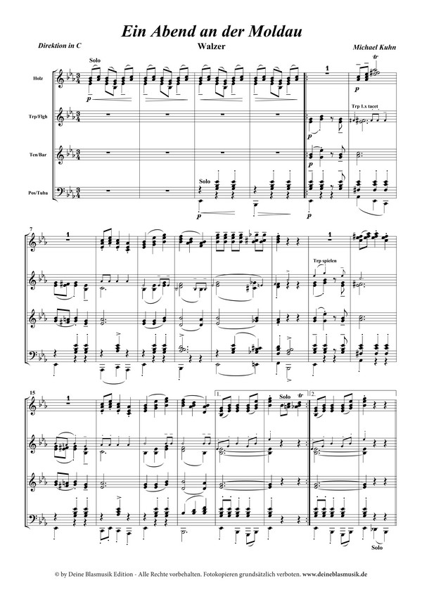 Walzer Michael Kuhn, der in der Blasmusik-Szene auch 'Polka-König' genannt wird, schuf mit 'Ein Abend an der Moldau' einen wunderbar gefühlvollen Walzer, dessen lyrische Melodie auch Ihr Publikum verzaubern wird. Inspiriert wurde der Komponist durch einen Besuch im böhmischen Krummau, als er den Sonnenuntergang und die abendliche Stille am Ufer der Moldau genoss. Der weiche Fluss des Wasser, die sanften Wellen und springenden Fischlein wurden auf zauberhafte Weise musikalisch gemalt und ergeben ein Bild der Ruhe, Sehnsucht und Kraft gleichermaßen.