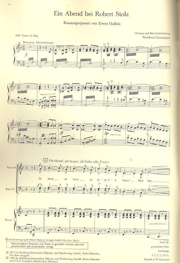 Halletz, Erwin, bearb. Ob blond ob braun ich liebe alle Frau'n Mein Herz ruft immer nur nach dir o Marita Die ganze Welt ist himmelblau Vor meinem Vaterhaus steht eine Linde Dann geh ich hinaus in den Wienerwald Wenn die kleinen Veilchen blühen Ich sing mein Lied heute nur für dich Auf der Heide blühen die letzten Rosen Musikant Musikant wo ist deine Heimat Du du du schliess deine Augen zu Mein Liebeslied muss ein Walzer sein Grieshaber, Reinhard, bearb.