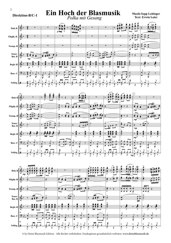 Loier, Erwin, Text Polka Der österreichische Komponist Sepp Leitinger, jedem Freund böhmischer Blasmusik längst ein Begriff, schafft mit seiner Polka "Ein Hoch der Blasmusik" abermals ein echtes musikalisches Schmankerl. In seiner typischen Weise abwechslungsreich und spannend instrumentiert, lässt Leitinger zusammen mit dem Textdichter Erwin Loier unser aller Hobby hochleben! Dabei spielen die Autoren auf wunderbare Weise mit unseren Emotionen. Mal einfühlsam und lyrisch, mal fetzig und laut und natürlich immer mit Melodielinien, die hängen bleiben und in einer grandiosen Trio-Reminiszenz niemanden auf dem Stuhl halten.