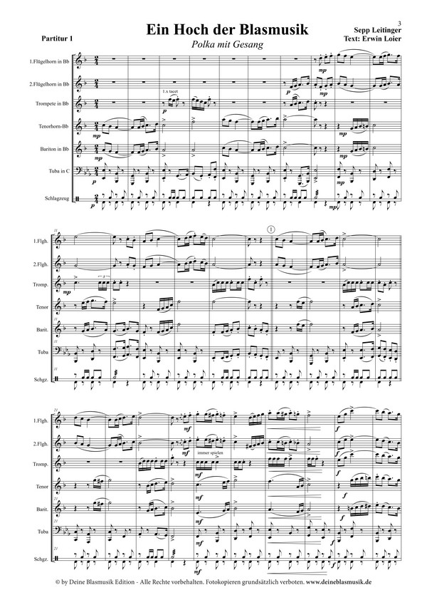 Loier, Erwin, Text Polka Der österreichische Komponist Sepp Leitinger, jedem Freund böhmischer Blasmusik längst ein Begriff, schafft mit seiner Polka "Ein Hoch der Blasmusik" abermals ein echtes musikalisches Schmankerl. In seiner typischen Weise abwechslungsreich und spannend instrumentiert, lässt Leitinger zusammen mit dem Textdichter Erwin Loier unser aller Hobby hochleben! Dabei spielen die Autoren auf wunderbare Weise mit unseren Emotionen. Mal einfühlsam und lyrisch, mal fetzig und laut und natürlich immer mit Melodielinien, die hängen bleiben und in einer grandiosen Trio-Reminiszenz niemanden auf dem Stuhl halten.