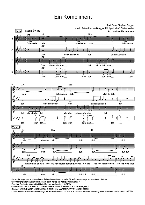 Bosse Hits a cappella "Ein Kompliment" ist wohl der bekannteste Song der deutschen Indie-Rock-Band "Sportfreunde Stiller" und auch nach über zwanzig Jahren aus der deutschen Popwelt nicht mehr wegzudenken. In der Bearbeitung für Chor erscheint diese Liebeserklärung an einen Lieblingsmenschen, anders als in typischen Popballaden, in schlichter, unaufgeregter Gestalt. Das rockige Original mit Band- und E-Gitarrensound hat Jan-Hendrik Herrmann in ein gleichermaßen grooviges Chor-Arrangement verwandelt, dabei die Atmosphäre des Originals aufgegriffen und seiner Bearbeitung trotzdem einen ganz eigenen Charakter verliehen. Die Melodiestimme wandert zu Beginn durch alle vier Stimmen, bevor sie ab der Mitte des Stücks zwischen Sopran und Tenor wechselt. Die dynamische Bandbreite wird abwechslungsreich genutzt, was bei gleichzeitig notwendiger rhythmischer Präzision eine reizvolle Herausforderung für Chöre darstellt. Deutscher Indie-Rock-Klassiker als Arrangement für gemischten Chor (SATB) Schlichte, unaufgeregte Liebeserklärung an einen Lieblingsmenschen Grooviges Stück mit großer dynamischer Bandbreite