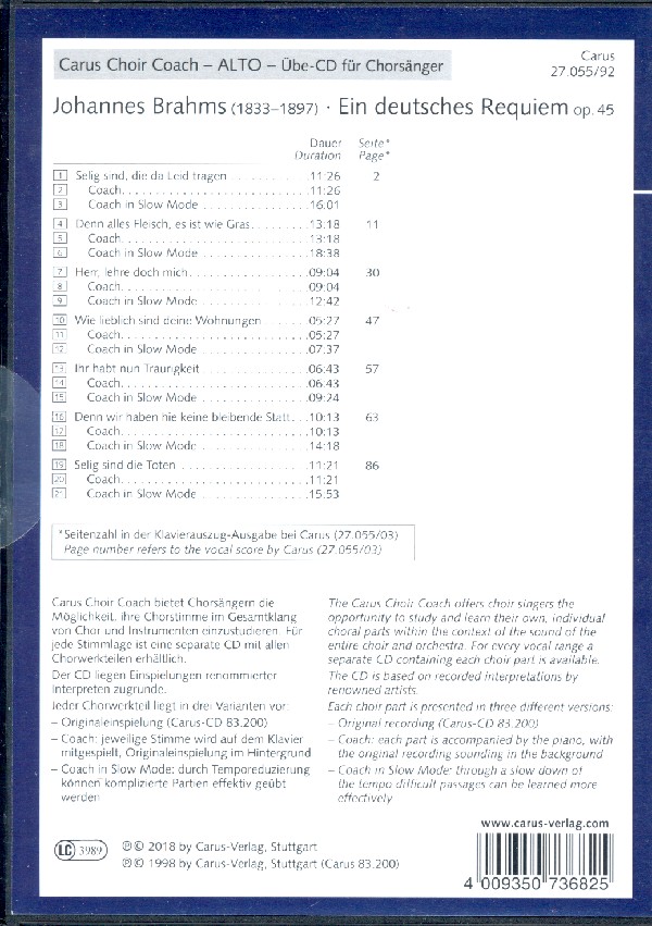 Carus Choir Coach Originaleinspielung Coach mit Klavierbegleitung (und Originaleinspielung im Hintergrund) Coach in Slow Mode (Temporeduzierung)