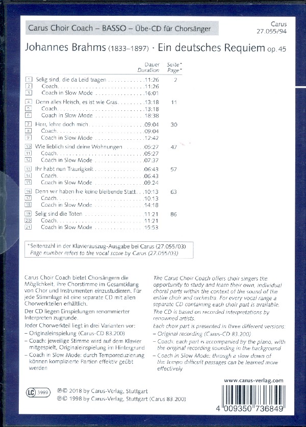 Carus Choir Coach Originaleinspielung Coach mit Klavierbegleitung (und Originaleinspielung im Hintergrund) Coach in Slow Mode (Temporeduzierung)