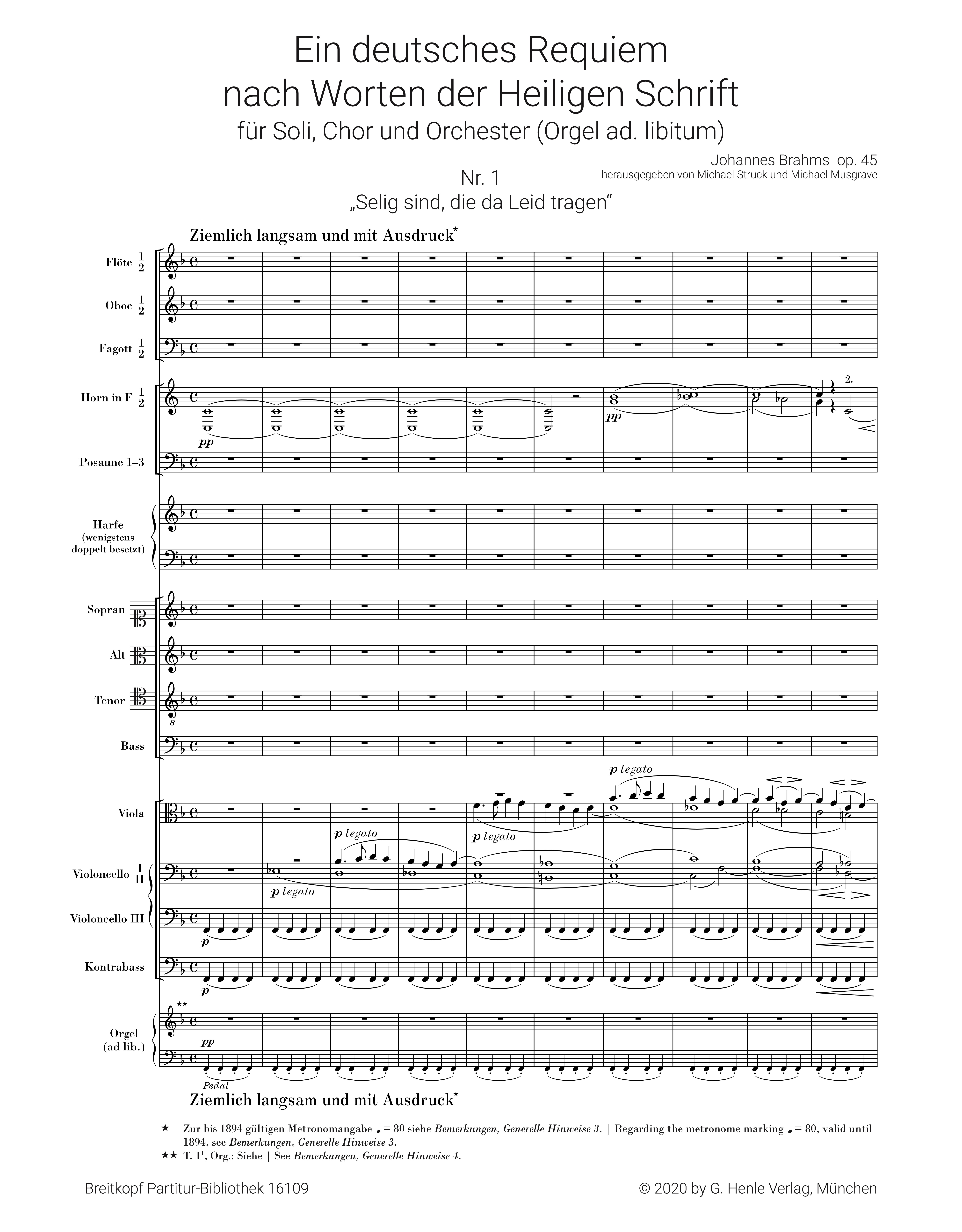Musgrave, Michael, ed Struck, Michael, ed Das Deutsche Requiem zählt zu den bekanntesten Requien weltweit, und das, obwohl es nicht den üblichen Requiemstext vertont. Brahms wollte nicht der lateinisch-katholischen Totenmesse folgen, die den Schrecken des Jüngsten Gerichts und die Erlösung des sündigen Menschen durch den Kreuzestod thematisiert. Brahms Augenmerk waren im Gegenteil Bibeltexte, die die Vergänglichkeit des Menschen und Trost in den Mittelpunkt stellen: Trost für die Hinterbliebenen und Trost für alle, die sich vor dem Tod fürchten. In gewisser Weise könnte man es als Inbegriff des Brahmsschen Schaffens bezeichnen. Im korrespondierenden Band der neuen Brahms-Gesamtausgabe, der die Grundlage für die praktische Neuausgabe ist, räumen die Herausgeber Michael Musgrave und Michael Struck mit allerlei Legenden, Irrtümern und fehlerhaften Lesarten auf. Nachträgliche kleine kompositorische Änderungen Brahms werden berücksichtigt, Fehlentscheidungen bisheriger Ausgaben werden korrigiert und der gesungene Bibeltext enthält Schreib- und Sinnkorrekturen. Darüber hinaus klären die Texte viele Mythen um die Entstehung der Komposition auf. So schafft diese Urtext-Ausgabe eine frische Perspektive auf das Menschen-Requiem, wie Brahms die Komposition am liebsten genannt hätte. 1. Selig sind, die da Leid tragen 2. Denn alles Fleisch es ist wie Gras 3. Herr, lehre doch mich, dass ein Ende mit mir haben muss 4. Wie lieblich sind deine Wohnungen, Herr Zebaoth 5. Ihr habt nun Traurigkeit 6. Denn wir haben hie keine bleibende Stadt 7. Selig sind die Toten, die in dem Herren sterben