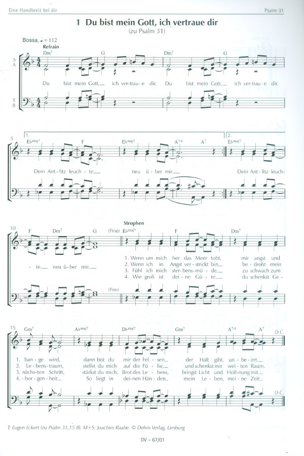 29 Chorsätze und Arrangements zum Psalmliederbuch Du bist mein Gott ich vertraue dir Leben erwacht Eine Handbreit bei dir Sind wir nicht alle Königskinder Macht alle Türen auf Stärk mir den Rücken guter Gott Tu mir Gutes Gott Du unser Halt in allem Wandel Ein grünender Ölbaum in deinem Haus Du hörst mein Beten Wie ist es um das Recht bestellt Du brichst zu uns auf Kann es sein dass du verwirfst Zum Himmel schau ich freu mich deiner Werke Möchte mit des Adlers Flügel Gott lass uns neue Töne finden Ist Jahwe König freue dich Erde Singt spielt und tanzt Halle Halleluja Du höre mein Gebet Vor dem Morgenstern Als Israel in Knechtschaft seufzte Bist du da bin ich geborgen Liebe zeigt sich täglich neu Und wir saßen da und weinten Streite mit denen die gegen mich streiten Dir singe ich mein Lied Wir könnten wir dich je vergessen Jubelt feiert jauchzt unserm Gott