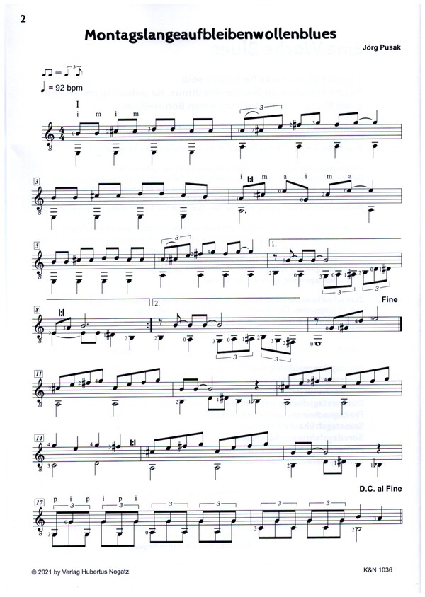 8 leichte Bluesstücke für Gitarre solo. Frische Melodien im Shuffle-Rhythmus, für jeden Tag der Woche einen Blues . . . plus einen schweren Bonus-Blues! Zusammen mit einigen meiner Schüler*innen sind die Stücke im Unterricht erdacht, komponiert und gespielt worden. Dabei haben wir uns an melancholisch klingenden Blue-Notes, am Shuffle-Rhythmus und der ein oder anderen Triole erfreut. Die Stücke sind geeignet als Unterrichtsliteratur für die Unterstufe. Die Tonart angebenden üblichen Vorzeichen am Zeilenanfang wurden bewusst nicht vorgegeben. Alle Vorzeichen finden sich unmittelbar vor der jeweiligen Note. Die Tempoangaben in beats per minute (bpm) sind nur als Vorschlag zu verstehen. Bei Bedarf ist das Tempo frei wählbar. Der Charakter der Stücke bleibt trotzdem erhalten. Zudem sind folgende gitarristisch-technischen Herausforderungen zu bewältigen: - den versetzten und gleichzeitigen zweistimmigen Anschlag mit Leersaiten im Bass - den zweistimmigen Anschlag mit gegriffenen Saiten im Bass - das Melodiespiel auf den Basssaiten (Basso ostinato) - das Spiel mit Anlegen (Apoyando) und ohne Anlegen (Tirando) - das Lagenspiel sowie wenige Barrégriffe Zum schnelleren Verständnis sind die Fingersätze und die Angaben zur Lage (z.B. II) vorgegeben. Das Hinweiszeichen I:I zeigt die enge Lage an. Dabei greifen zwei Finger auf benachbarten Saiten im gleichen Bund. Montagslangeaufbleibenwollenblues Dienstagslangschläferblues Mittwochsmitteninderwocheblues Donnerstagsdonnerwetterblues Freitagsnacheinsmachtjederseinsblues Samstagsfrühaufsteherblues Sonntagsfahrerausflugsblues Mutterodervatertagsbonusblues