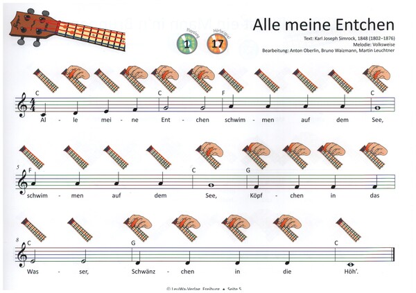 Alle meine Entchen Ist ein Mann in'n Brunnen g'fallen Summ, summ, summ A,a a, der Winter, der ist da Hopp hopp hopp! Pferdchen lauf Galopp Kuckuck, Kuckuck, ruft's aus dem Wald Schlaf, Kindlein, schlaf Häschen in der Grube Mein Hut, der hat drei Ecken Hänschen klein Fuchs, du hast die Gans gestohlen Hänsel und Gretel Kommt ein Vogel geflogen Bruder Jakob Brüderchen, komm, tanz mit mir Backe backe Kuchen