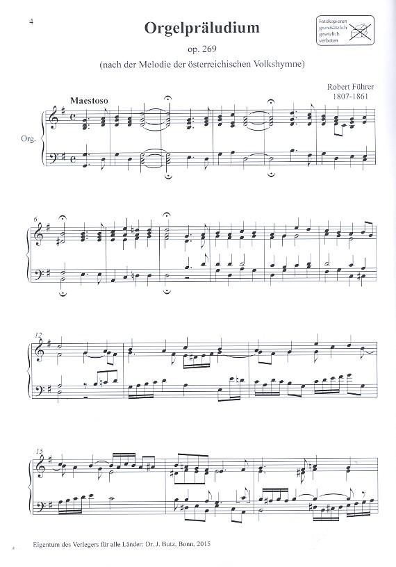 Romantische Orgelbearbeitungen zur Melodie der deutschen Nationalhymne Orgelpräludium op.269 (Führer) Fuga (Sechter) Präludium (Gruber) Einleitung und Fugato (Gruber) Präludium (Halbmayr) Introduktion, Thema und Variationen (Dollhopf) Paraphrase (Dittrich) Introduktion, Passacaglia und Fuge (Dité)