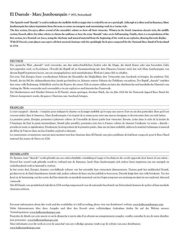 Das spanische Wort ?duende? wird verwendet, um einen unbeschreiblichen Zauber oder Magie zu beschreiben. Marc Jeanbourquin hat sich von diesem Begriff inspirieren lassen, um ein energiegeladenes und unterhaltsames Werk im Latino-Stil zu schaffen, das von Virtuosität, ein bisschen Sinnlichkeit im danzón und jeder Menge Charme geprägt ist. Mit El Duende können die Musiker ihr ganzes musikalisches Charisma zum Ausdruck bringen.