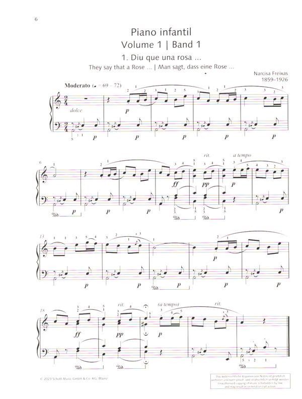 Leichte Klavierstücke Mit 'Piano infantil' veröffentlichte die katalanische Komponistin Narcisa Freixas einen Klavier-Zyklus für junge Spielerinnen und Spieler. Diese Neuausgabe in der Reihe 'Student Edition Repertoire' fasst die ersten beiden Bücher der sehr leichten und kurzen Charakterstücke unter dem Titel 'Elementary Piano Pieces' zusammen. Herausgeberisch betreut wurde diese Neuausgabe von Melanie Spanswick, die das Repertoire um Fingersätze, Tempo- und Pedalangaben ergänzte und spielpraktische Anleitungen zu allen Stücken verfasste. Inhalt: Diu que una rosa.../They say that a Rose.../Man sagt, dass eine Rose El soldat de plom/The Plumb Soldier/Der Zinnsoldat El ratolí/The Mouse/Die Maus Una mica dombra/A Little Shade/Ein wenig Schatten La guardiola/The Piggy Bank/Das Sparschwein La dansa/The Dancer/Der Tänzer La son/The Sleep/Der Schlaf Locell/The Bird/Der Vogel La nina rossa/The Red Girl/Die blonde Puppe La nina maca/The Cute Doll/Die niedliche Puppe La nina que encara (és petita)/The Still Doll (she is small)/Die Puppe, die noch klein ist La nina adormida/The Sleeping Doll/Die schlafende Puppe La nina que dansa/The Dancing Doll/Die tanzende Puppe La Pepa/The Doll/Die Puppe