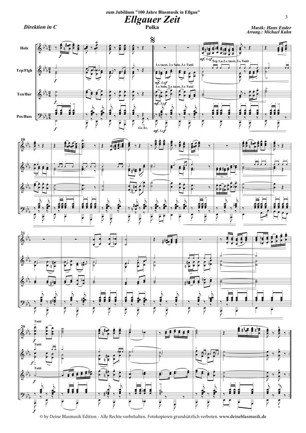 Mit über 50 Jahren Erfahrung an Trompete und Flügelhorn schuf Hans Ender, ein Erzmusikant aus dem Raum Augsburg, sein Erstlingswerk: die Polka ""Ellgauer Zeit"". Diese Komposition entstand anlässlich des Jubiläums ""100 Jahre Blasmusik in Ellgau"" und ist eine Hommage an seinen Heimatverein. Ellgauer Zeit vereint alles, was eine Polka unvergesslich macht: wohlklingende Melodien, einen satten Klang im tiefen und hohen Blech sowie perlende Klarinetten, die zum Träumen einladen. Auch Tuba und Trompete setzen kraftvolle Akzente. Veredelt wurde das Werk vom renommierten Polka-Experten Michael Kuhn, dessen Arrangement dem Stück eine besondere Strahlkraft verleiht. Lassen Sie sich von der ""Ellgauer Zeit"" in die Welt der Blasmusik entführen ? ein musikalisches Erlebnis, das Herz und Ohr gleichermaßen erfreut!