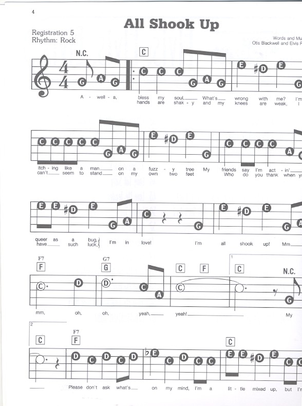 All shook up A big hunk o' love Blue suede shoes Can't help falling in love Don't Don't be cruel Now and then there's a fool such as i Good luck charm Hard headed woman Heartbreak hotel Hound dog I beg of you I got stung I need your love tonight I want you i need you i love you I'm left you're right she's gone It's now or never Jailhouse rock Long tall sally Love me tender Loving you Return to sende Stuck on you Surrender Let me be your teddy bear Treat me nice Wear my ring around your neck Ez play today series