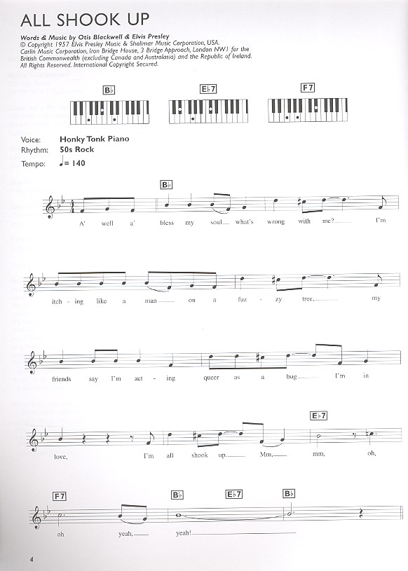 Easiest Keyboard Collection All shook up Always on my mind Are you lonesome tonight Blue suede shoes Can't help falling in love A fool such as I Good luck charm Heartbreak hotel His latest flame (Marie's the name) Marie's the name Hound dog It's now or never Jailhouse rock King creole Let me be your teddy bear Teddy bear Love me tender One night Return to sender Suspicious minds That's all right The wonder of you Way down Wooden heart