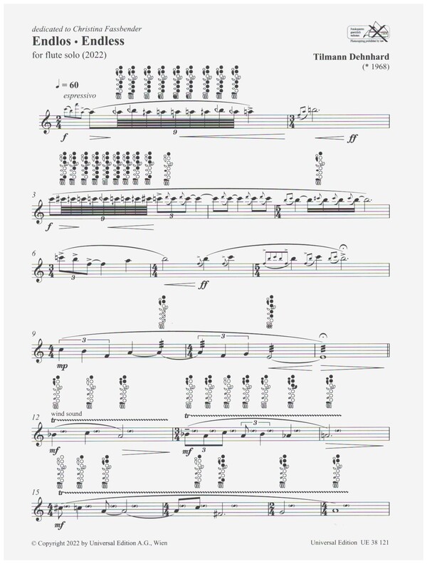 Tilmann Dehnhard ist ein Garant für besondere Klangkompositionen, so auch bei Endlos, diesem bemerkenswerten Werk für Flöte solo, das moderne Spiel- und Atemtechniken miteinander verbindet. Dehnhard richtet den Notentext mit Griffbildern und Spielanweisungen ein, um sich den nuancierten Tonhöhenänderungen, die oft kleine Variationen um einen Ton herum verlangen, intonatorisch zu nähern. Viele Taktwechsel unterstützen die rhythmischen Differenzierungen, aus denen die Energie des ausdrucksstarken Solos im fortgeschrittenen Schwierigkeitsgrad gewonnen wird. Die Anwendung der Zirkularatmung perfektioniert den Fluss des Werkes, dessen Klangwelt man sich kaum entziehen kann. Es empfehlen sich eine Ringklappenflöte mit H-Fuß sowie Vorkenntnisse im zeitgenössischen Flötenspiel.