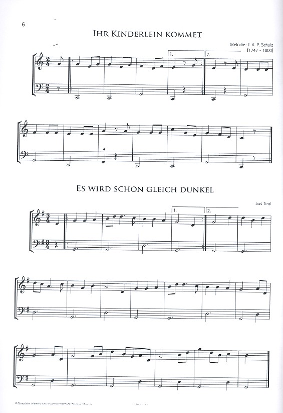 Varner, Johanna, arr. Laßt uns froh und munter sein Morgen kommt der Weihnachtsmann Es ist ein Ros entsprungen Ihr Kinderlein kommet Es wird schon gleich dunkel Kling Glöckchen klingelingeling Leise rieselt der Schnee Lieb Nachtigall wach auf Macht hoch die Tür Schneeflöckchen Weißröckchen Still still still Vom Himmel hoch da komm ich her Alle Jahre wieder Es kommt ein Schiff geladen Fröhliche Weihnacht überall Herbei o ihr Gläubigen Ihr Kinderlein kommet O du fröhliche Stille Nacht heilige Nacht Joseph lieber Joseph mein Kindlein zart O Tannenbaum Lobt Gott ihr Christen allzugleich Maria durch ein Dornwald ging