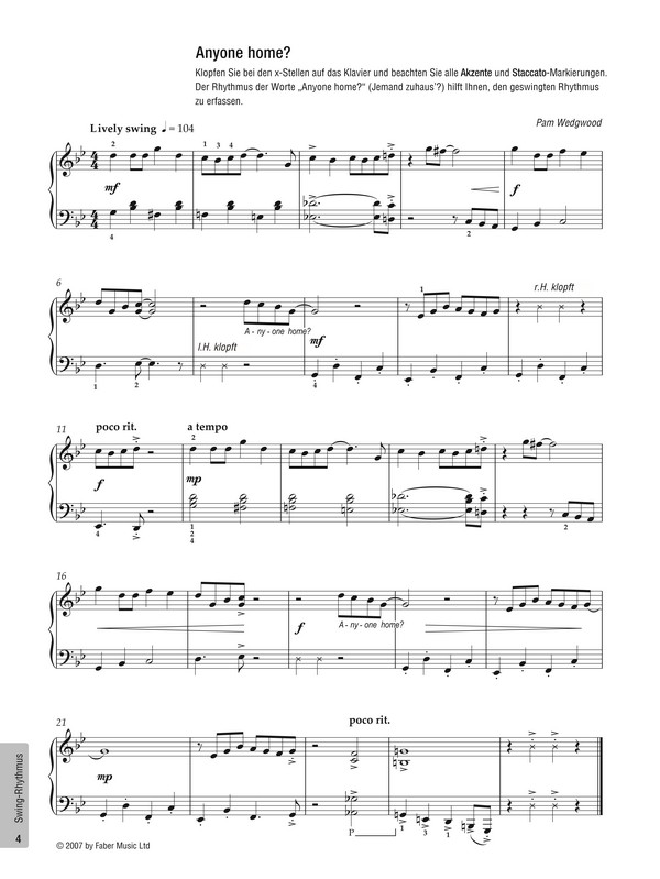 Wedgwood, Olly, ed Der Band Es ist nie zu spät ... Jazz zu spielen bietet allen Jazz-Fans die Möglichkeit, bereits im frühen Lernstadium die wundervolle Welt des Jazz am Klavier zu entdecken eine wunderbare Ergänzung für all jene, die die Klavierschule Es ist nie zu spät ... Klavier zu lernen erfolgreich absolviert haben. Behutsam werden Jazz-spezifische Themen wie geswingter Rhythmus, Synkopen, Walking Bass, Blues und Improvisation eingeführt. Mit berühmten Jazz-Standards wie I Get a Kick Out of You, A Nightingale Sang in Berkeley Square, My Baby Just Cares for Me oder As Time Goes By sowie coolen Übungsstücken von Pam und Olly Wedgwood wird das Jazz-Spiel sanft trainiert und die Klaviertechnik stetig verfeinert. Begleit-Tracks sorgen für den authentischen Jazz-Sound und machen das Klavierspiel zu einem wahren Erlebnis. Pam Wedgwood (* 1947) ist eine der produktivsten und erfolgreichsten britischen Autorinnen von Unterrichts- und Spielliteratur für junge Instrumentalisten. Seit fast 20 Jahren versorgt sie Lehrende und Lernende mit ebenso grundlegendem wie inspirierenden Repertoire. Ihre bahnbrechende Klavierschule Es ist nie zu spät Klavier zu lernen gibt Erwachsenen die Möglichkeit, mit einer speziell für sie entwickelten Methode Schritt für Schritt die wunderbare Welt des Klavierspielens für sich zu entdecken ganz ohne Vorkenntnisse.