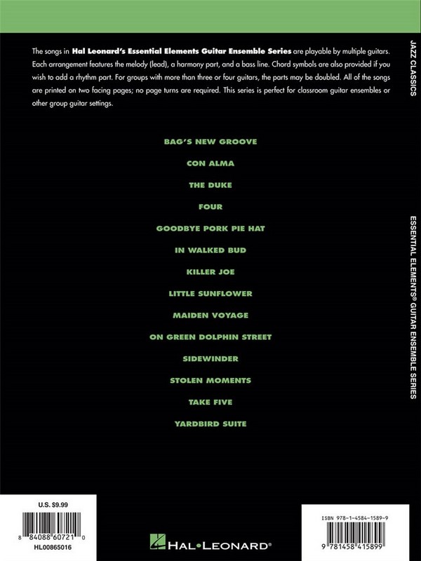 14 Songs Arranged for 3 or more Guitarists The songs in Hal Leonard's Essential Elements Guitar Ensemble Series are playable by multiple guitars. Each arrangement features the melody (lead), a harmony part, and a bass line. Chord symbols are also provided if you wish to add a rhythm part. For groups with more than three or four guitars, the parts may be doubled. Play all of the parts together, or record some of the parts and play the remaining part along with your recording. All of the songs are printed on two facing pages, no page turns are required. This series is perfect for classroom guitar ensembles or other group guitar settings. This folio features 14 classics: 1. Sidewinder 2. Con Alma 3. Bag's New Groove 4. Stolen Moments 5. The Duke 6. Four 7. Goodbye Pork Pie Hat 8. On Green Dolphin Street 9. Killer Joe 10. Little Sunflower 11. Maiden Voyage 12. Take Five 13. Yardbird Suite 14. In Walked Bud