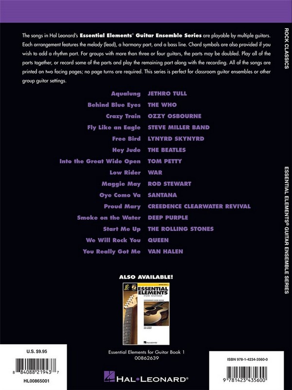 The songs in Hal Leonard's Essential Elements Guitar Ensemble series are playable by multiple guitars. Each arrangement features the melody (lead), a harmony part, and a bass line. Chord symbols are also provided if you wish to add a rhythm part. For groups with more than three or four guitars, the parts may be doubled. Play all of the parts together, or record some of the parts and play the remaining part along with your recording. All of the songs are printed on two facing pages, so no page turns are required. This series is perfect for classroom guitar ensembles or other group guitar settings 1. Low Rider 2. Into the Great Wide Open 3. Smoke On the Water 4. Aqualung 5. Behind Blue Eyes 6. Crazy Train 7. Fly Like An Eagle 8. Free Bird 9. Hey Jude 10. Maggie May 11. Oye Como Va 12. Proud Mary 13. Start Me Up 14. We Will Rock You 15. You really got me