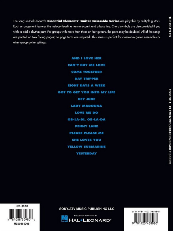 15 Classic Songs Arranged for Three or More Guitarists (mid intermediate) 1. And I Love Her 2. Come together 3. Yesterday 4. Can'T Buy Me Love 5. Day Tripper 6. Eight Days a Week 7. Got to Get You Into My Life 8. Hey Jude 9. Lady Madonna 10. Love Me Do 11. Ob-la-di, Ob-la-da 12. Penny Lane 13. Please please me 14. She Loves You 15. Yellow Submarine