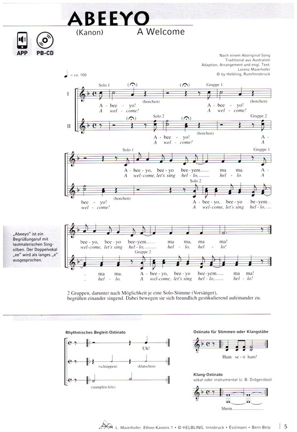 Nachfolgeausgabe für C5377 Die vorliegende Sammlung mit 14 kanonischen Warm-up-Songs für Schulchor und Klasse bietet eine klangvolle musikalische Weltreise: Australien, Asien, Afrika, Amerika. Die in verschiedenen Kulturkreisen wurzelnden Kanons können ein- oder mehrstimmig gesungen und mit den musikalischen Patterns vielfältig begleitet werden. In dieser Weise eröffnen sich leicht nachvollziehbare Wege und Einblicke in charakteristische Klangwelten unterschiedlicher Kulturen. Auswahl und Aufbereitung der Stücke sind gezielt auf die Verwendung in der musik- und chorpädagogischen Praxis abgestimmt: Körper- und Stimmerfahrung, Rhythmuserlebnis, Stimmbildung, Hörerziehung, Bewegungsgestaltung u. a. m. Zu jedem Stück werden diesbezüglich Anregungen, Tipps und konkrete Übungen angeboten. Neben der primären Verwendung der Stücke als Warm-ups können die Ethno-Kanons auch mit individueller kreativer Gestaltung sehr wirkungsvoll aufgeführt werden. Auf der HELBLING Media App finden Sie als ideale Ergänzung und Arbeitshilfe alle 14 Ethno-Kanons in einer Gesamtaufnahme als ideale Unterstützung einer ganzheitlichen und motivierenden Erarbeitung.