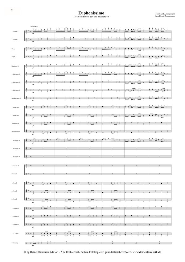 In der vorliegenden Komposition 'Euphonissimo' spielen sie eine führende solistische Rolle und ihre gesangliche Thematik korrespondiert sehr harmonisch mit dem Holzregister und den anderen Blechbläsern. Eine sehr melodiöse, getragene Komposition, die sich für jedes Konzert hervorragend eignet und - egal ob solistisch oder als Register-Solo gespielt - die Tenorhörner/Baritone in ihrem herrlichen Sound glänzen lässt.