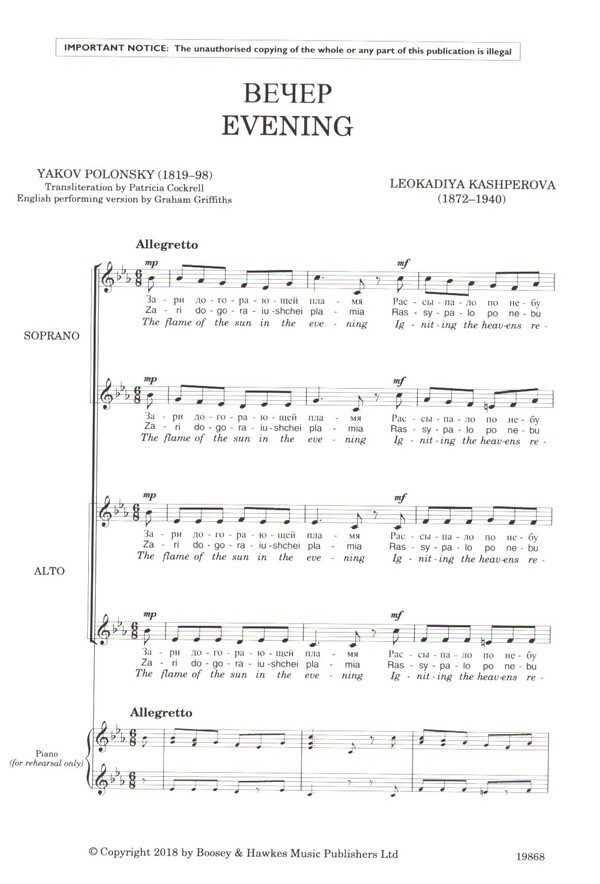 | Untertitel: | for female chorus (SSAA) a cappella score (en/kyr/Umschrift) |
