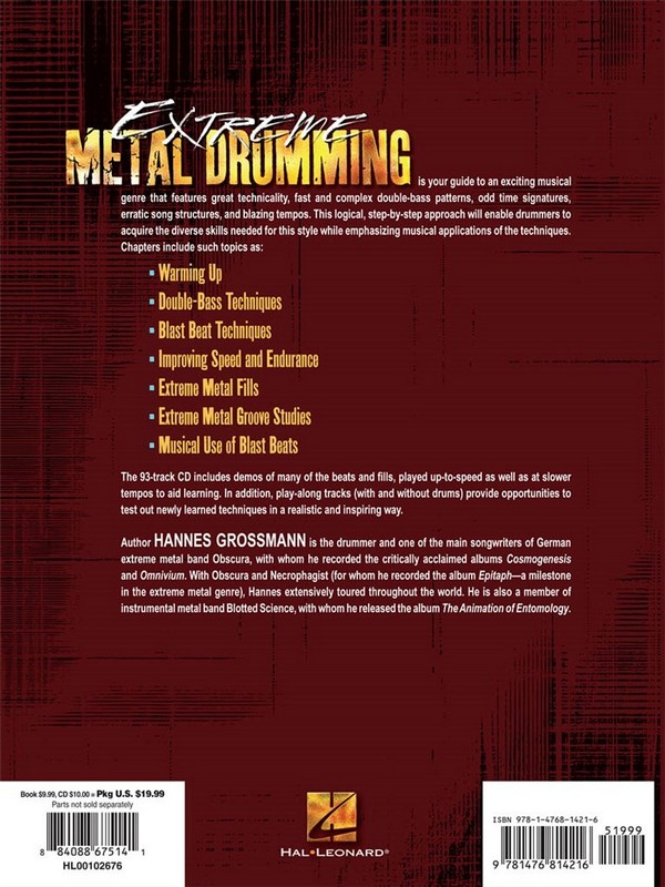 Exteme Metal Drumming is your guide to an exciting musical genre that features great technicality, fast and complex double-bass patterns, odd time signatures, erratic song structures, and blazing tempos. This logical, step-by-step approach will enable drummers to acquire the diverse skills needed for this style while emphasizing musical applications of the techniques. Includes a foreword by George Kollias.
