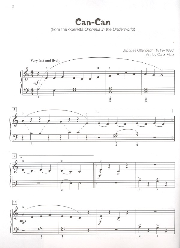 Matz, Carol, arr. early intermediate Andaluza (Granados) Barber of Seville (Rossini) Can-Can (Offenbach) Eine kleine Nachtmusik (Mozart) Gymnopédie no.1 (Satie) Hungarian Dance no.5 (Brahms) Italian Symphony (Mendelssohn) March of the Toreadors (Bizet) March Slav (Tschaikowsky) O mio babbino caro (Puccini) Polovetsian Dance (Borodin) Swan Lake (Tschaikowsky) From the New World (Dvorak) Waltz no.15 (Brahms)
