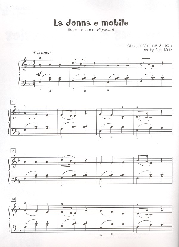 Matz, Carol, arr. intermediate Ave Maria (Gounod) Canon (Pachelbel) Clair de lune (Debussy) Funeral March of a Marionette (Gounod) Habanera (Bizet) Hornpipe from Water Music (Händel) In the Hall of the Mountain King (Grieg) La donna e mobile (Verdi) Theme from piano Concerto no.1 (Tschaikowsky) The Swan (Saint-Saens) Un bel dì (Puccini)