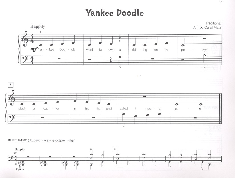 Matz, Carol, arr. Alouette The Bear went over the Mountain Camptown Races Humpty Dumpty I'm a little Teapot Mary had a little Lamb The Mulberry Bush Row row row your Boat Shoo, fly This old Man Twinkle twinkle little Star The Wheels on the Bus Yanke Doodle