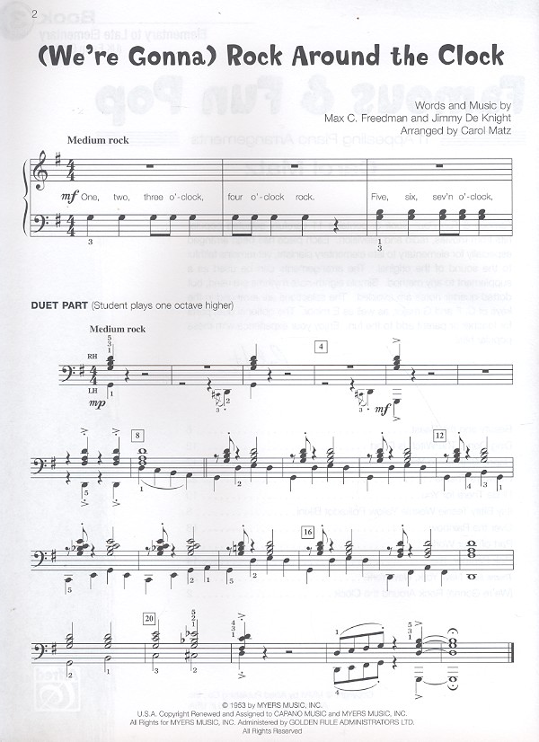 Matz, Carol, arr. elementary to late elementary Beauty and the Beast Ding-Dong the Witch is dead Happy Birthday to You Hedwig's Theme I'll be there for You Itsy Bitsy Teenie Weenie Yellow Polkadot Bikini Over the Rainbow Part of your World The Pink Panther Theme from New York New York Rock around the Clock