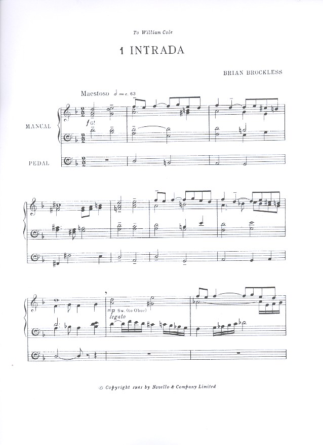 Intrada (Brian Brockless) Fanfare (Guy H. Eldridge) Fanfare (Tony Hewitt-Jones) Fanfare (C.S. Lang) 2 short fanfares (Eric H. Thiman) Solemn procession (Lloyd Webber) Fanfare (Arthur Wills) 8 pieces by modern composers