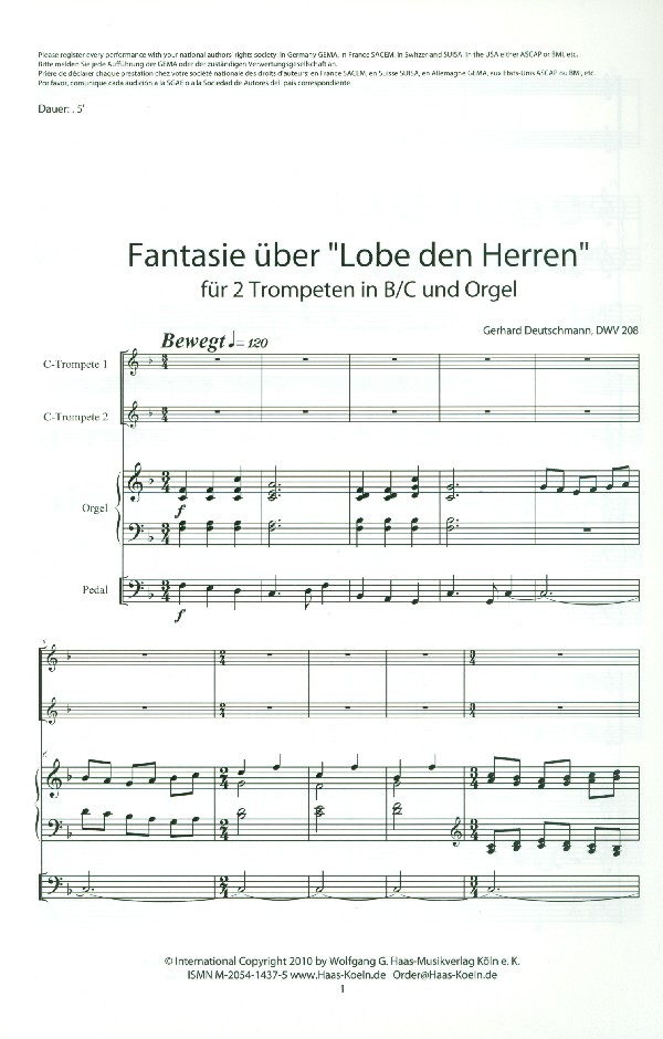 | Untertitel: | für 2 Trompeten und Orgel Partitur und Stimmen |